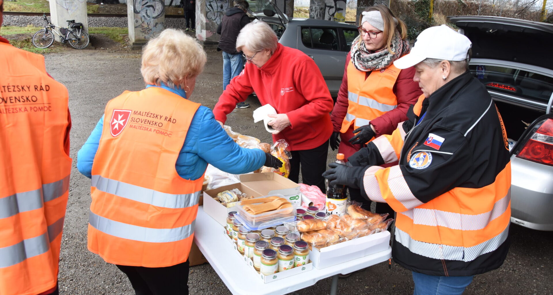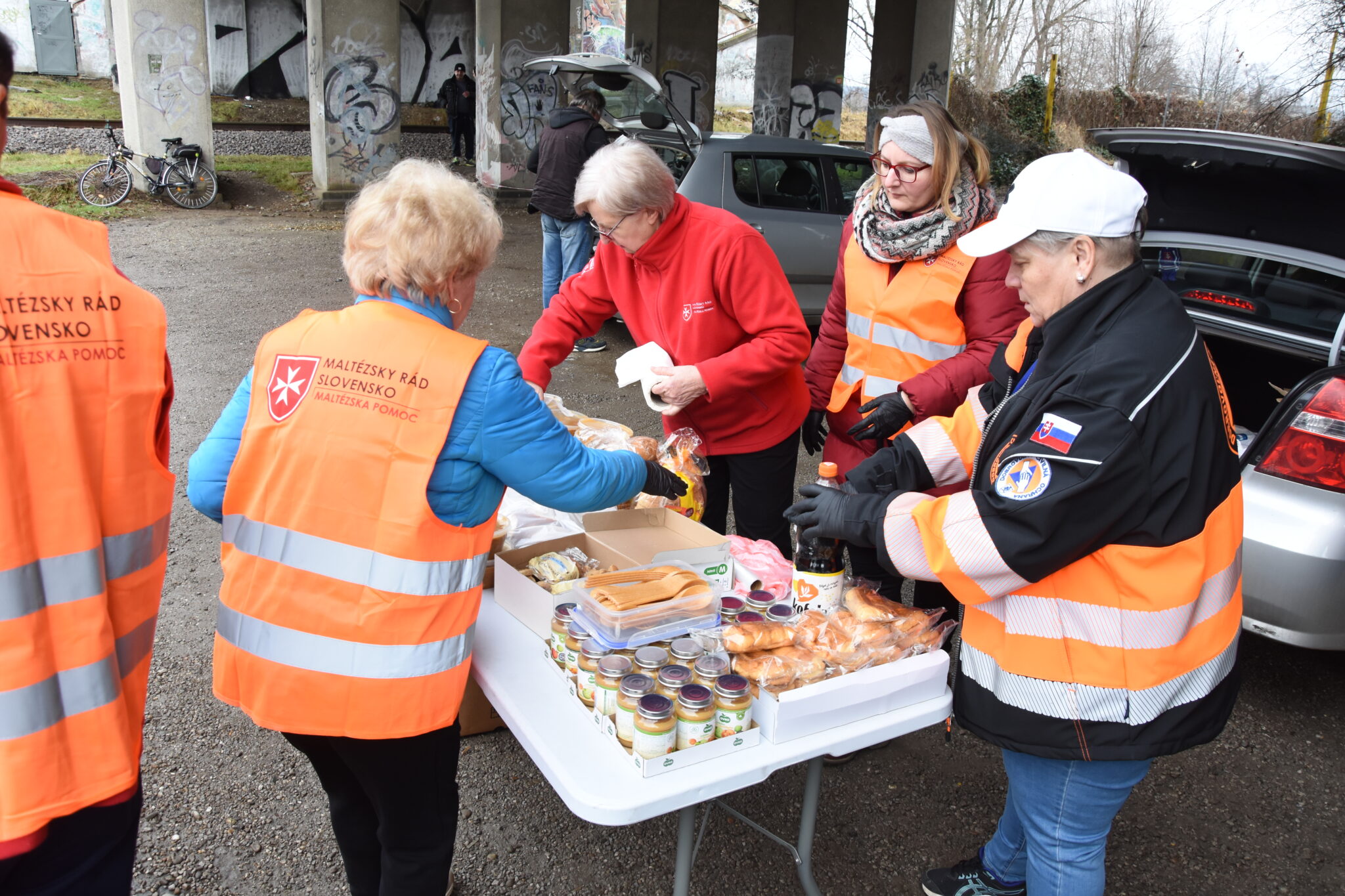 Každú sobotu sa v Trenčíne pod mostom rozdáva teplé jedlo, chlieb, ovocie a trvanlivé potraviny pre ľudí v núdzi. V zimných mesiacoch dobrovoľníci pridávajú aj teplé ponožky, ktoré sa rýchlo opotrebujú. Vďaka minuloročnej zbierke Ponožkový október sa podarilo vyzbierať 2150 párov, ktoré pomohli nielen v Trenčíne, ale aj v ďalších mestách, kde Maltézska pomoc poskytuje sociálne služby.